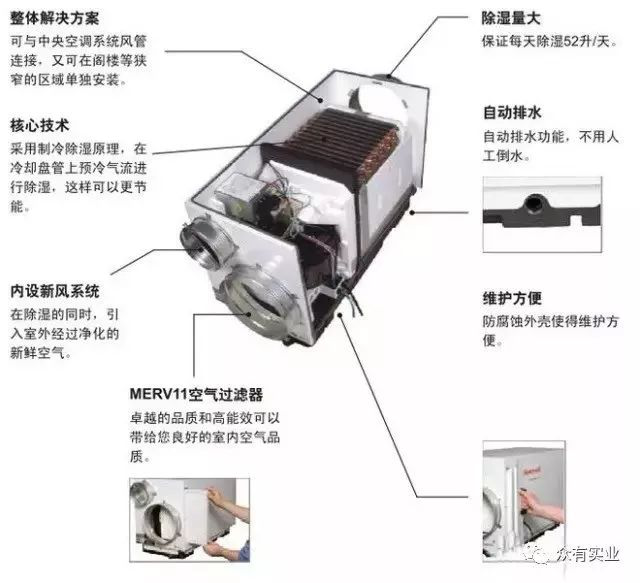 B、風機:風機的質量決定了工業除濕機的循環風量,是影響工業除濕機除濕能力的重要部件,好的工業除濕機都采用工業通風專用的離心式風機,出風量大,噪音低,使用壽命長。