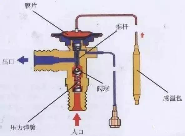 起節流降壓的作用,經冷凝器冷凝后的高壓制冷劑液體經過節流閥時,因受阻而使壓力下降,導致部分制冷劑液體汽化,同時吸收氣化潛熱,其本身溫度也相應降低,最為低溫低壓的濕蒸汽,然后進入蒸發器。