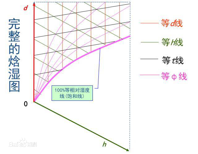 以比焓h-縱坐標,以含濕量d-橫坐標,表示大氣壓力B一定時濕空氣各個參數(shù)之間的關(guān)系。包含五種線群: