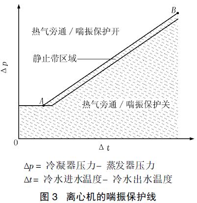 機(jī)組通過本機(jī)集總控制裝置(PIC)監(jiān)測壓縮機(jī)電機(jī)的電流來判斷機(jī)組是否進(jìn)入喘振工況。一旦機(jī)組電流的波動(dòng)幅度超過一定值(默認(rèn)是25%,也可以通過控制面板LID設(shè)定)達(dá)1s,控制系統(tǒng)就會(huì)記下一次喘振。如果在設(shè)定時(shí)間段內(nèi)( 默認(rèn)是5 min) 這樣的波動(dòng)達(dá)到12次,控制系統(tǒng)就認(rèn)為機(jī)組運(yùn)行進(jìn)入了喘振工況, 機(jī)組就會(huì)停止運(yùn)行并報(bào)警(EXCESSIV E COMPR SU RGE)。這樣就對(duì)機(jī)組進(jìn)行了保護(hù),防止喘振對(duì)機(jī)組的損壞。此外,還可以通過可選配件-熱氣旁通閥,當(dāng)機(jī)組將要進(jìn)入喘振工況時(shí)打開熱氣旁通閥來改善機(jī)組的工況,達(dá)到對(duì)機(jī)組的喘振保護(hù)。