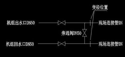 旁通閥門建議與機(jī)組的進(jìn)出水口徑一致,若現(xiàn)場的變徑比例不大的情況下旁通閥門可以適當(dāng)?shù)臏p小但必須滿足機(jī)組的水循環(huán)。