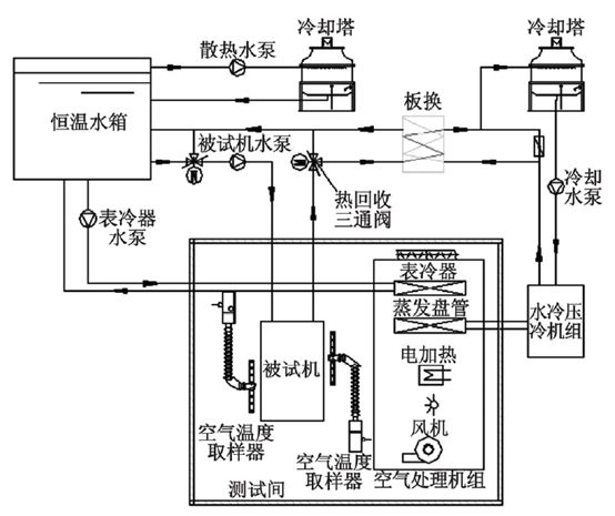 風(fēng)冷冷(熱)水機(jī)組測(cè)試系統(tǒng)依據(jù)的相關(guān)標(biāo)準(zhǔn)主要有:GB/T10870-2014《蒸氣壓縮循環(huán)冷水(熱泵)機(jī)組性能試驗(yàn)方法》、ARI550/590-2003《蒸汽壓縮循環(huán)冷水( 熱泵) 機(jī)組》、GB/T18430.1-2007《蒸汽壓縮循環(huán)冷水(熱泵)機(jī)組/工商業(yè)用及類(lèi)似用途的汽壓縮循環(huán)冷水(熱泵)機(jī)組》、GB/T18430.2-2008《蒸汽壓縮循環(huán)冷水(熱泵)機(jī)組/戶(hù)用及類(lèi)似用途的汽壓縮循環(huán)冷水(熱泵)機(jī)組》。上述標(biāo)準(zhǔn)中明確了測(cè)量風(fēng)冷冷(熱)水機(jī)組的主要性能指標(biāo),而測(cè)試系統(tǒng)能夠模擬標(biāo)準(zhǔn)中規(guī)定的各種工況,并能測(cè)試出風(fēng)冷冷(熱)水機(jī)組的各項(xiàng)性能指標(biāo)。研究、設(shè)計(jì)風(fēng)冷冷(熱)水機(jī)組測(cè)試系統(tǒng)也需嚴(yán)格遵照上述標(biāo)準(zhǔn)的要求。