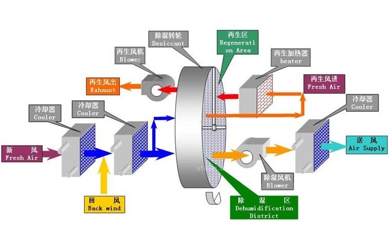 轉(zhuǎn)輪除濕機(jī)的核心結(jié)構(gòu)是一個(gè)不斷轉(zhuǎn)動(dòng)的轉(zhuǎn)輪,是由特殊復(fù)合耐熱材料制成的波紋狀,載有吸濕劑的蜂窩狀轉(zhuǎn)輪,蜂窩狀轉(zhuǎn)輪具有吸濕比表面積大、流通阻力小、除濕效率高等特點(diǎn)。
