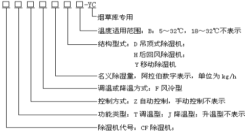 型號示例: CFZF20-YC 表示名義除濕量為20kg/h,進風溫度1832℃,固定式自動調溫型煙草庫專用除濕機組。