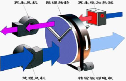 上述的除濕和再生過程是同時發(fā)生的,周而復始,保證了除濕機持續(xù)穩(wěn)定的工作狀態(tài)。