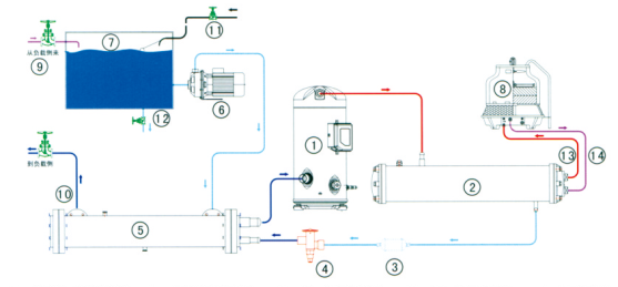 1、壓縮機(jī) 2、殼管式冷凝器 3、干燥過濾器 4、熱力膨脹閥 5、干式蒸發(fā)器 6、不銹鋼水泵 7、水箱